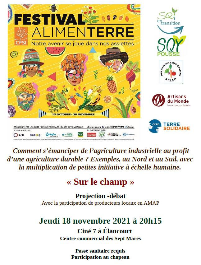 Dans le cadre du festival Alimenterre, participez à la projection-Débat « Sur le champ » le 18 novembre au Ciné7 d’Elancourt à 20h15, dont le thème principal est « Notre avenir se joue dans nos assiettes ».