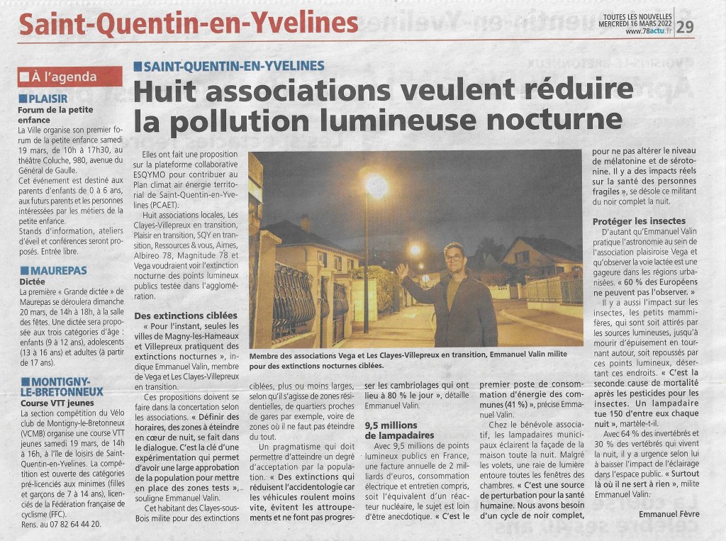Huit associations veulent réduire la pollution lumineuse nocturne 18 mars 2022Non classéStéphanie Le Brusq Article paru dans Les Nouvelles de Versailles Partager: Cliquez pour partager sur Facebook(ouvre dans une nouvelle fenêtre) Facebook Cliquer pour partager sur Bluesky(ouvre dans une nouvelle fenêtre) Bluesky J’aime chargement…