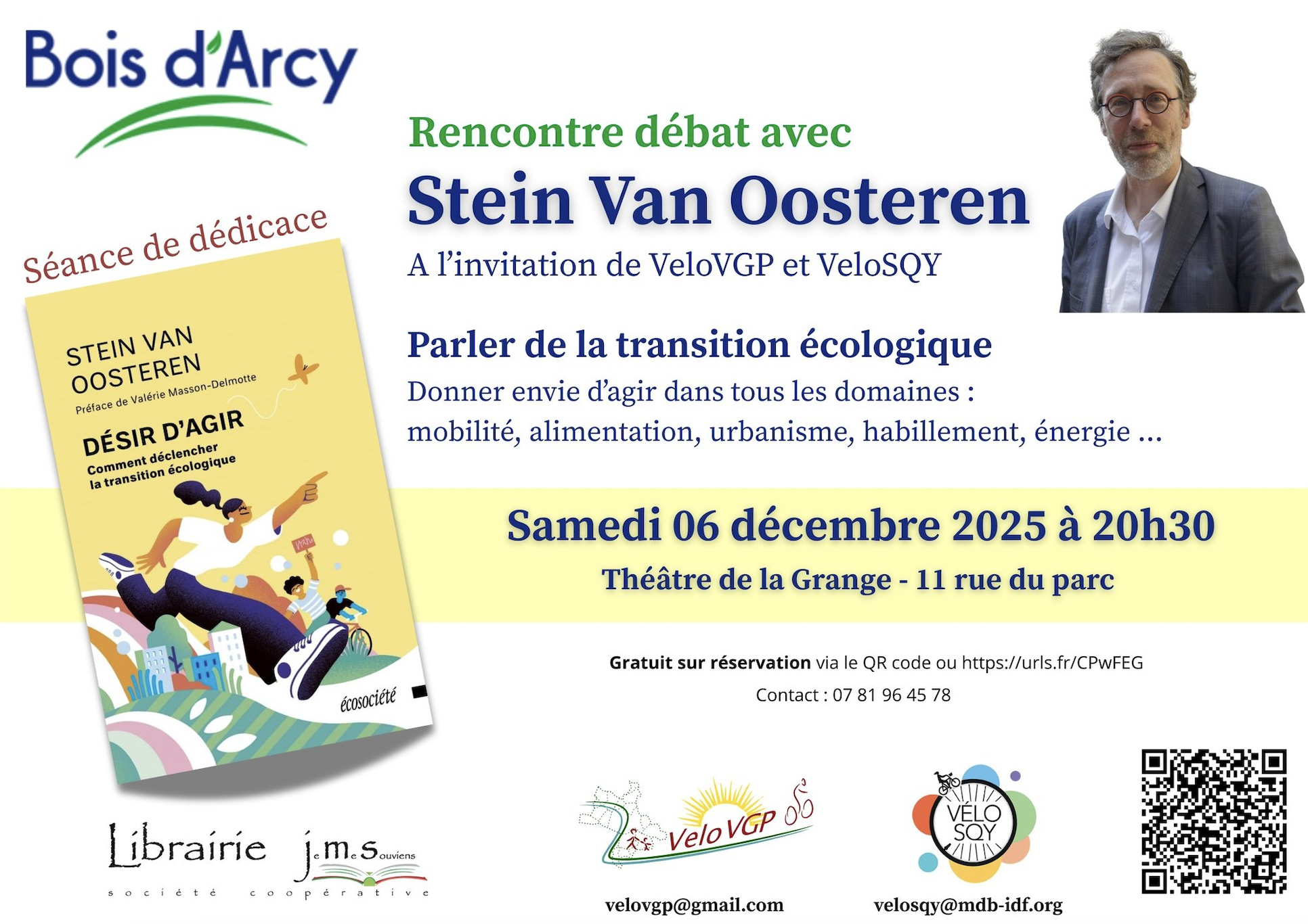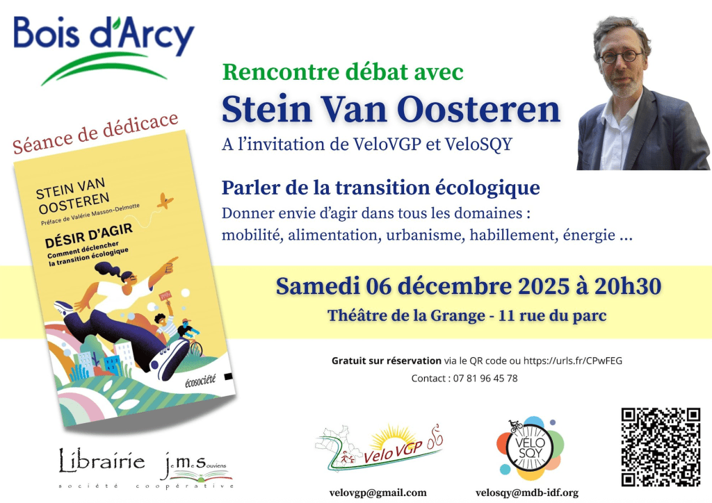 VéloVGP, VéloSQY et la mairie de Bois d’Arcy co-organisent une conférence/débat avec Stein Van Oosteren, ancien porte porte-parole du « Collectif Vélo Ile-de-France » à l’occasion de la sortie de son nouveau livre « Désir d’agir » (https://ecosociete.org/livres/desir-dagir).