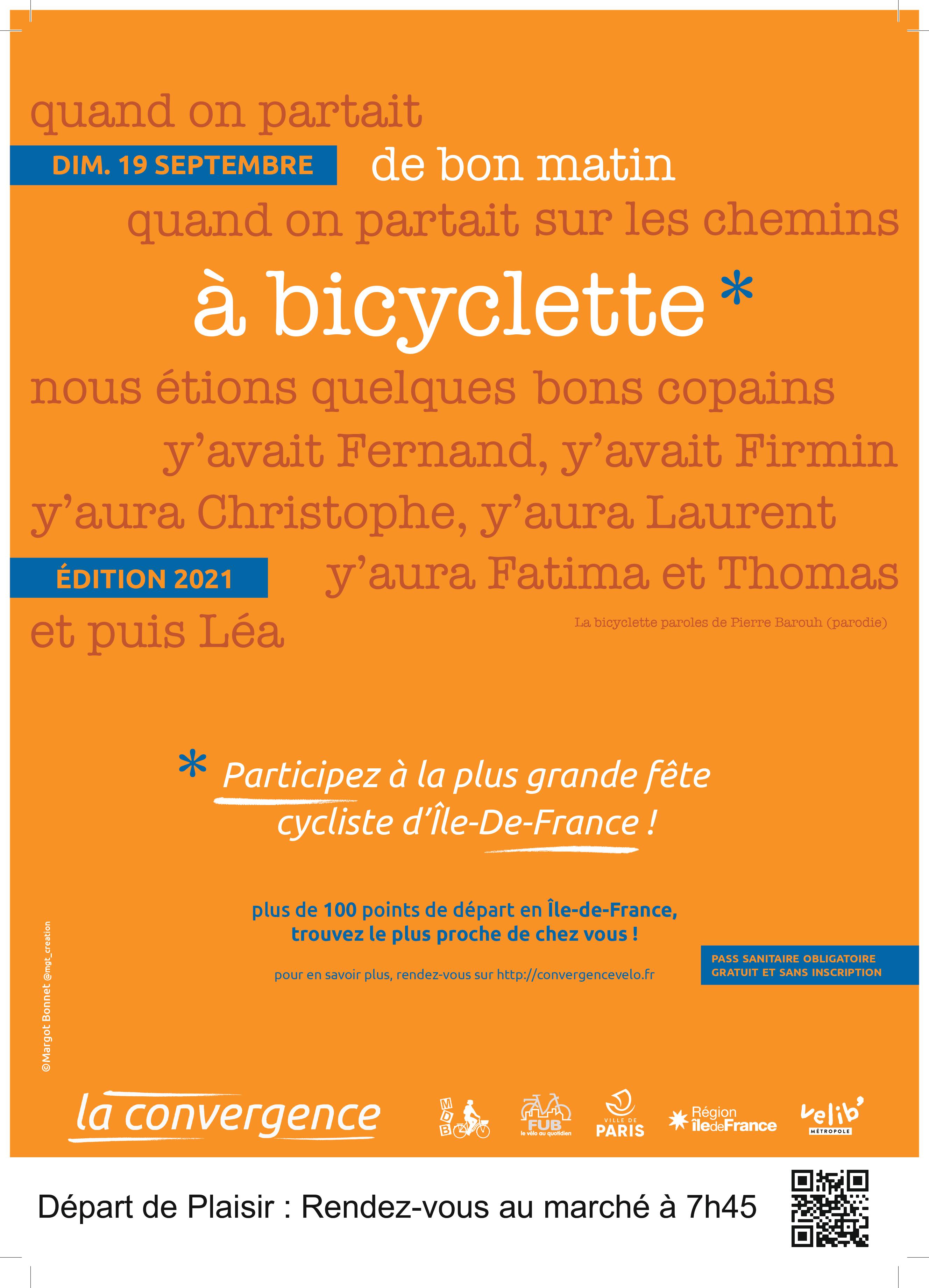 Dimanche19 septembre, c’est la Fête du Vélo ! Petits et grands de 7 à 99 ans, cyclistes d’un jour ou vélotaffeurs de toujours, rejoignez-nous pour participer à la Convergence Vélo, le plus grand rassemblement cycliste d’Île-de-France. Une journée unique où le vélo prend toute sa place. Une journée pour montrer que le vélo en ville, ça change la vie ! Relevez le défi et roulez vers Paris avec nous.