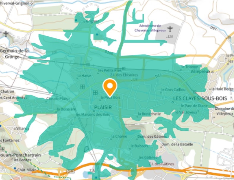 Concrètement, à l’échelle d’un quartier comme celui du Valibout à Plaisir, voici les destinations accessibles en moins 15 min à vélo (4 km) :