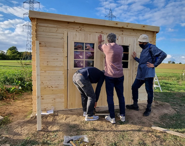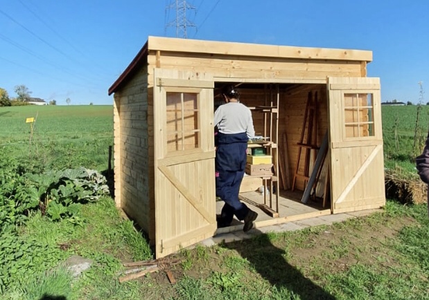 Cabane tant attendue qui va servir à collecter l’eau de pluie si précieuse en été, à entreposer nos outils, à stocker ponctuellement notre production, les patates par exemple, à installer un tableau où seront reprises nos actions à faire, etc.