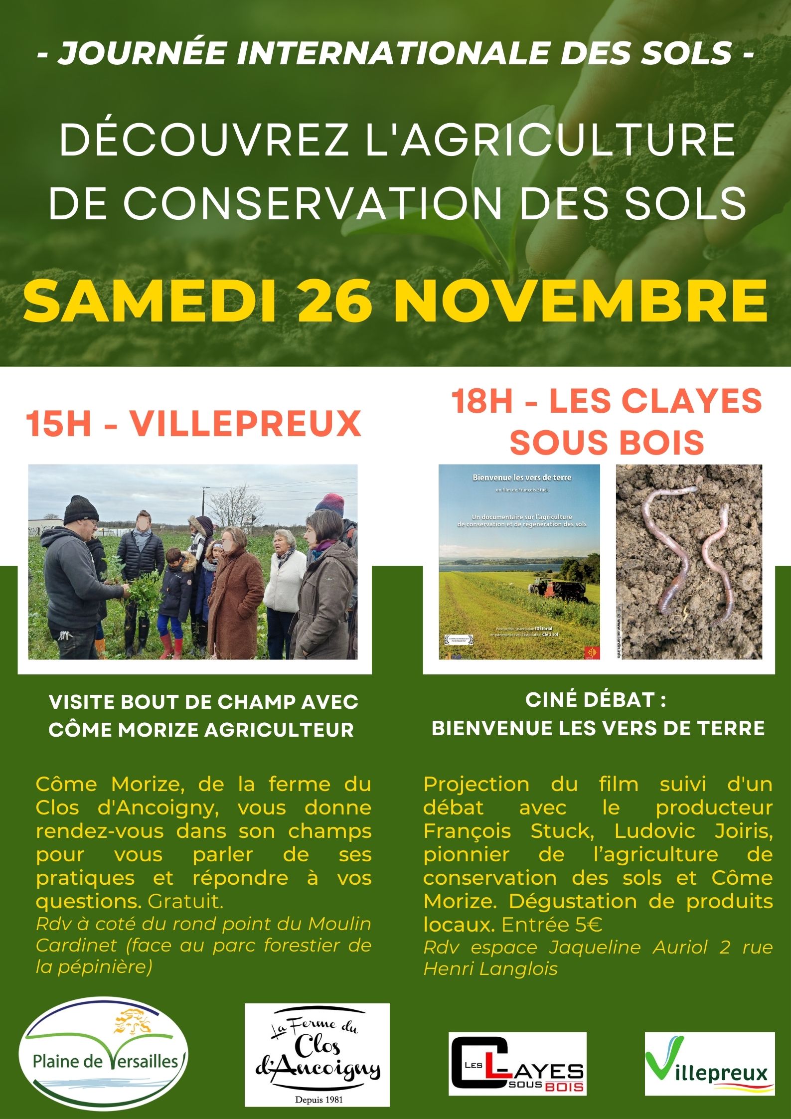 A 18h aux Clayes Sous Bois : projection du film « Bienvenue les vers de terre » à l’espace Jacqueline Auriol aux Clayes sous bois. La projection se clôturera par un débat avec le producteur F.Stuck. Entrée 5€.