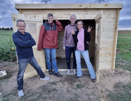 Cabane tant attendue qui va servir à collecter l’eau de pluie si précieuse en été, à entreposer nos outils, à stocker ponctuellement notre production, les patates par exemple, à installer un tableau où seront reprises nos actions à faire, etc.